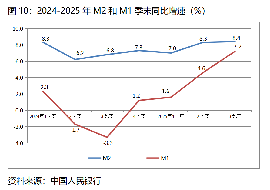 (五)广义货币供应量(M2)增速比上半年末和上年同期均保持回升,狭义货币供应量(M1)增速比上半年末和上年同期也均保持回升。三季度末,广义货币供应量同比增长8.4%,比上半年末增长8.3%回升了0.1个百分点,比上年同期增长6.8%回升了1.6个百分点;狭义货币供应量同比增长7.2%,比上半年末增长4.6%回升了2.6个百分点,而上年同期为下降3.3%。M2和M1涨幅的持续扩大,表明今年以来的货币政策较好地保持 了适度宽松的方向,但从经济回升的需要看,货币政策仍需要保持进一步宽松的必要。