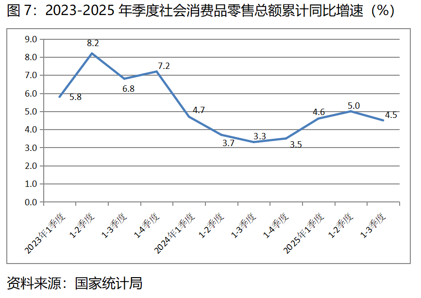 图7:2023-2025年季度社会消费品零售总额累计同比增速(%)