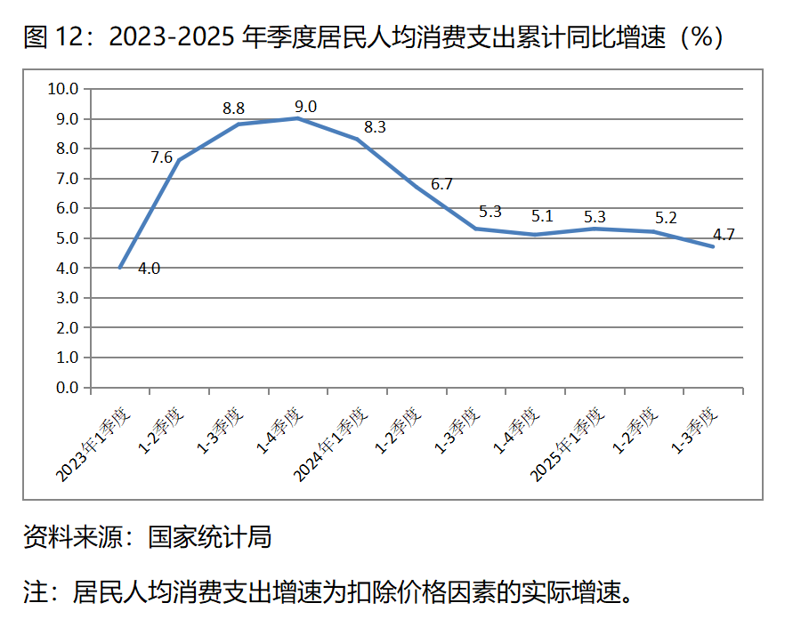 图12:2023-2025年季度居民人均消费支出累计同比增速(%)