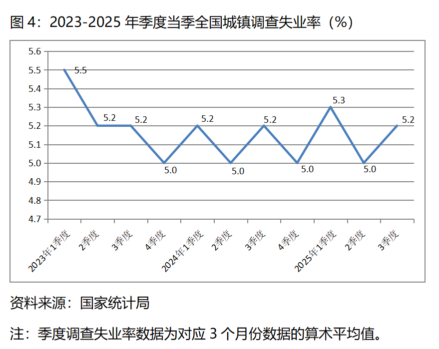 图4:2023-2025年季度当季全国城镇调查失业率(%)