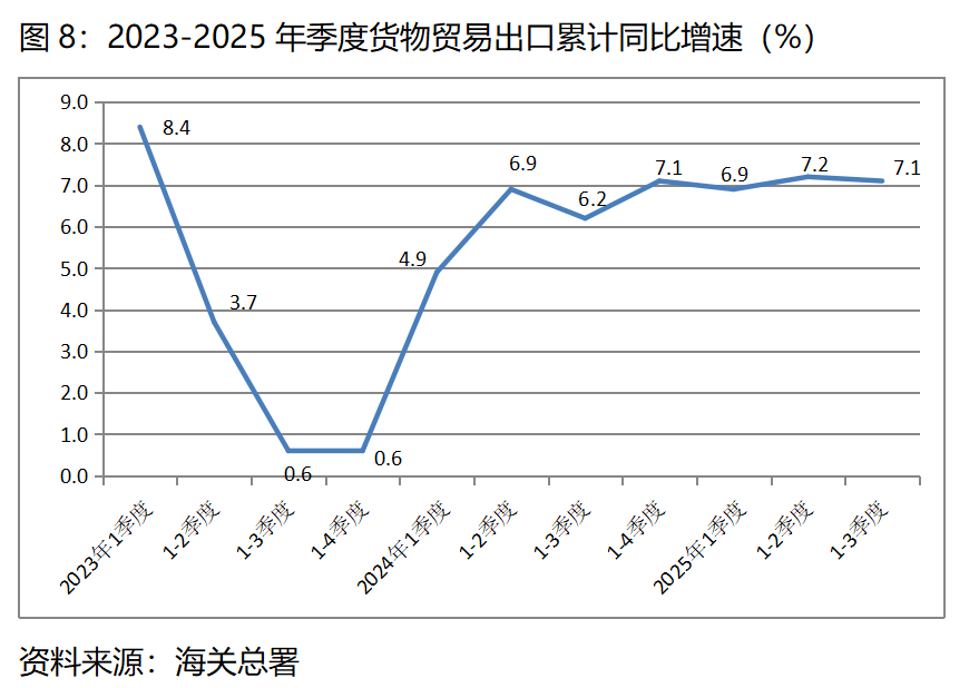 图8:2023-2025年季度货物贸易出口累计同比增速(%)