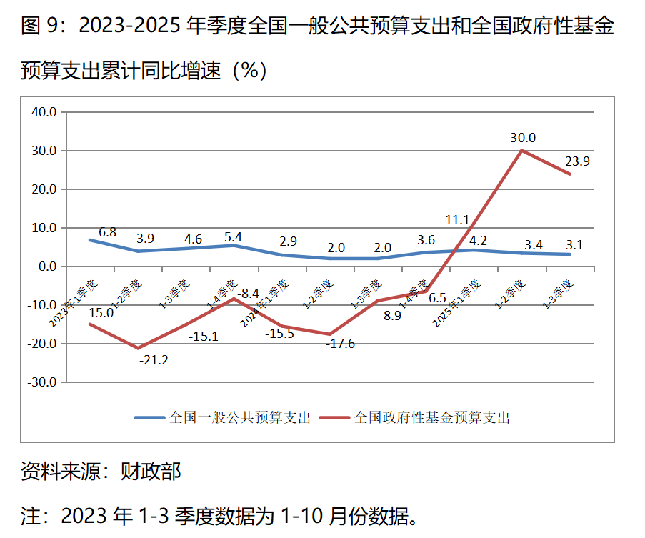 图9:2023-2025年季度全国一般公共预算支出和全国政府性基金预算支出累计同比增速(%)