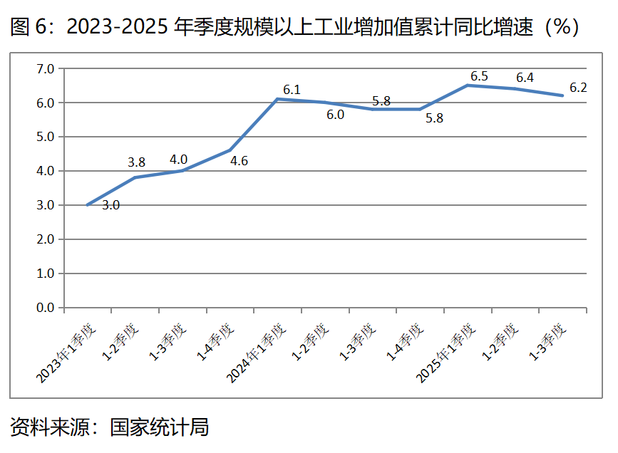 图6:2023-2025年季度规模以上工业增加值累计同比增速(%)